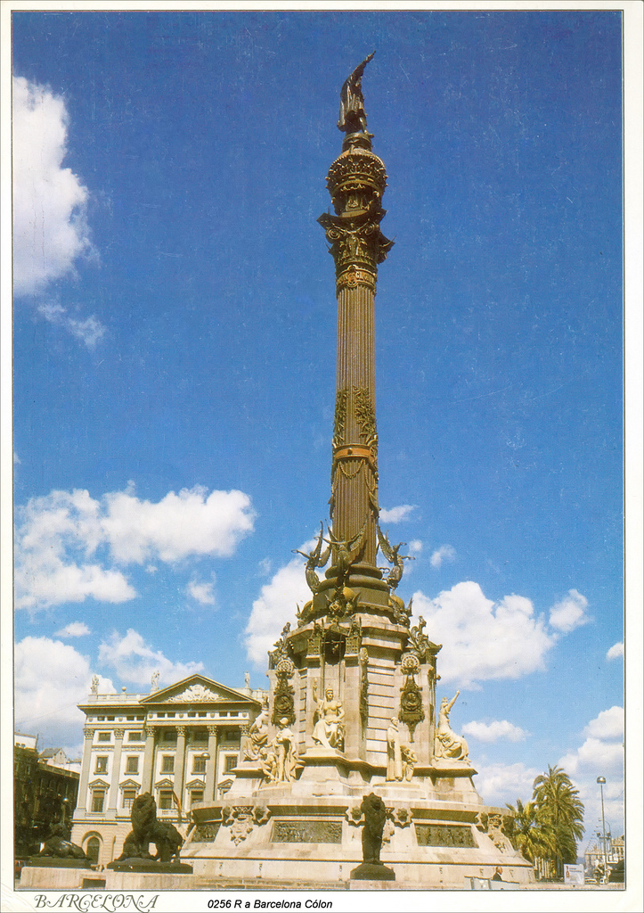 At the very top of the monument stands a 7.2 m (24 ft) tall bronze statue atop a 40 m (131 ft) tall Corinthian column. The statue was sculpted by Rafael Atché and is said to depict Columbus pointing towards the New World with his right hand, while holding a scroll in the left. It is a commonly held belief that instead of pointing to the west towards the New World, the statue points east towards Columbus's supposed home city of Genoa.[2] This, however, is not true, as the statue points south-southeast (a more southerly direction than the adjacent Rambla Del Mar and almost a perfect extension of the direction of La Rambla, Barcelona) and in effect is pointing at a point somewhere near the city of Constantine, Algeria. To point at Genoa in northern Italy the statue would have to face east-northeast and point up the coastline. It is more likely that the statue is situated in the current way simply to have Columbus point out to sea underscoring his achievements in naval exploration. The statue is atop a socle, on which the word "Tierra" (land) is inscribed.
