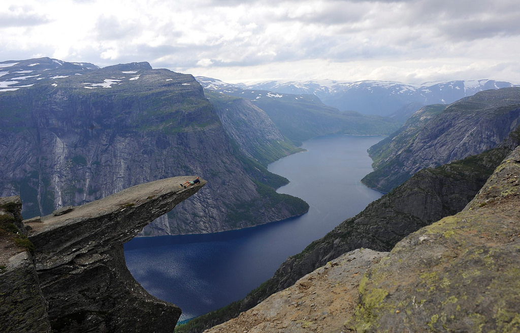 Trolltunga is one of the most spectacular scenic cliffs in Norway. Trolltunga is situated about 1100 meters above sea level, hovering 700 metres above lake Ringedalsvatnet. The view is breathtaking. The hike starts in Skjeggedal and goes through the high mountains, takes 10-12 hours (23 km in total to Trolltunga and return) and the ascent is about 900 meters. It is a long and hard hike. The hike is usually possible to do from mid-June, depending on when the snow melts in the mountains. Normally one can hike to Trolltunga until mid-September. Consider carefully whether you are in good enough shape and have the right equipment before setting out. There is no mobile phone coverage along the route. WARNING - DO NOT HIKE TO TROLLTUNGA IN WINTERTIME, except from mid-March when you can join guided snowshoe hikes with Trolltunga Active. All nature based activities are at your own risk. You will need sturdy hiking boots, bring extra clothing and be prepared for bad weather. Bring map and compass, plenty to eat and drink, a torch and a simple first aid kit. Weather in the high mountains can change quickly - check the latest weather forecast before going to Trolltunga. Do not hike to Trolltunga in strong wind, heavy rain or in foggy weather. It is always colder in the mountains than down by the fjord. Respect the nature. Every year there are search and rescue operations for hikers in serious trouble. Prepare well and be a responsible and safe hiker. Start early in the morning. Norway is far north, meaning daylight is short from September and nights are very cold. We recommend starting at latest 8:00 in the morning. If you want to stay overnight in the mountain area around Trolltunga you have to bring your own tent. Contact Odda Tourist Office at turistkontor@odda.kommune.no for more detailed information about the hike, accommodation and maps. GUIDED TOURS The outdoor adventure company Trolltunga Active offers guided tours. Alt. 1: Guided tour along the trail to Trolltunga. (end-May - mid-October) Alt. 2: A guided bike, hike and via ferrata climb to Trolltunga. (end-May - mid-October) Alt. 3: A guide snowshoe hike to Trolltunga (mid-March - end-May) www.trolltunga-active.com TRAVEL AND PARKING, PRIVATE CAR Drive to Tyssedal (6 km from Odda) on route 13. Follow signs to Skjeggedal and Trolltunga. After about 7 km you reach the parking place in Skjeggedal. Parking in Skjeggedal (200 NOK/day) or Tyssedal (100/day) (2016). The parking fee is used to finance public facilities in the area. PUBLIC TRANSPORTATION: BETWEEN ODDA AND SKJEGGEDAL (starting point for the hike) Trolltunga shuttle: (15 June - 15 Sept.) Pick-up service from the major providers of accommodation in Odda. You have to book your ticket in advance: www.oddataxi.no Tel: 53 64 14 44 Public bus service: Route 995, www.skyss.no. (no booking, cash only) TRAVEL FROM BERGEN Bus route 930 Bergen-Odda www.skyss.no (no booking, cash only) TRAVEL FROM OSLO Alt. 1: Train Oslo-Voss www.nsb.no . Bus route 990 Voss-Odda www.skyss.no (no booking, cash only) Alt. 2: Coach service "Haukeli ekspressen" Oslo-Odda www.nor-way.no (Book online) TRAVEL FROM STAVANGER AND PREIKESTOLEN Coach service "The Trolltunga-Preikestolen express" (during high season) Stavanger-Preikestolen-Røldal-Odda-Tyssedal-Lofthus-Kinsarvik. www.tide.no (Book online)